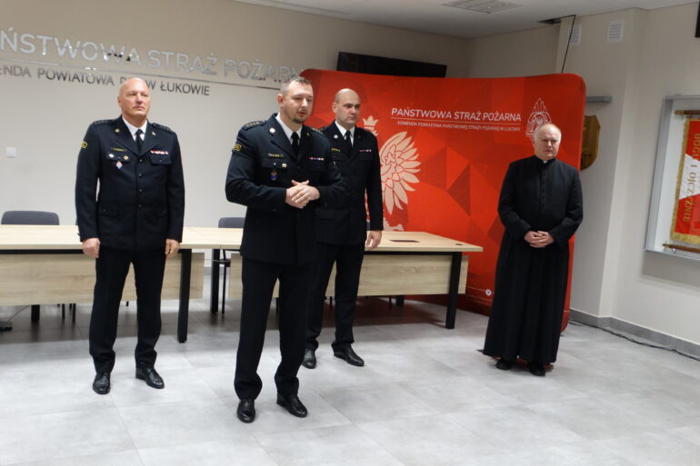 Komendant Powiatowy Państwowej Straży Pożarnej w Łukowie st. kpt. Konrad Turski przekazał wszystkim funkcjonariuszom, pracownikom cywilnym oraz emerytom, a także ich rodzinom, serdeczne życzenia bożonarodzeniowe i noworoczne. W swoim wystąpieniu podziękował za zaangażowanie, profesjonalizm, odpowiedzialność oraz codzienne zaangażowanie na rzecz służby.